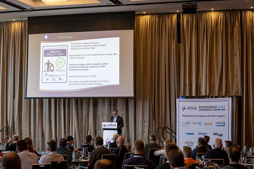 The Association of Rotational Moulders Australasia (ARMA) is avidly educating its membership about the Operation Clean Sweep program and have set big goals around the expectations of our industry to pledge their cooperation with the program. Chemistry Australia is one of the joint licensees of OCS in Australia and Peter Bury, their Director of Strategy, Energy and Research, presented at the rotational moulding industry conference, Rotomould 2022, held recently in Melbourne.